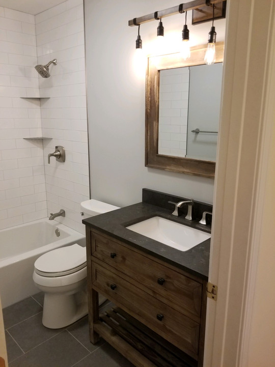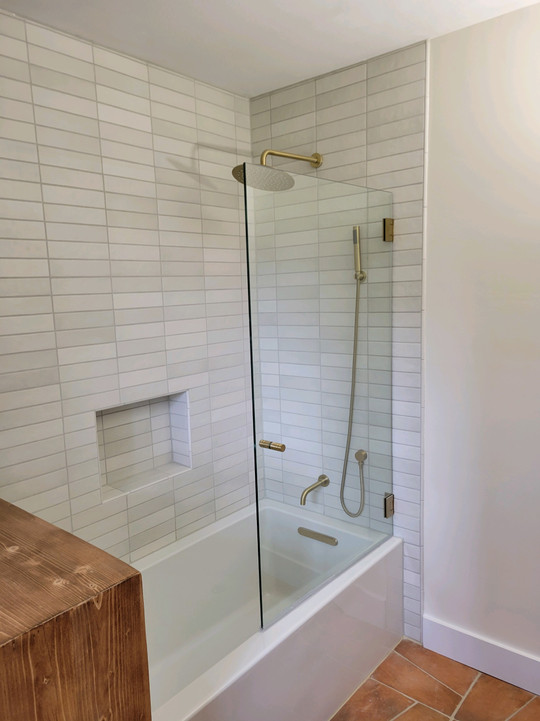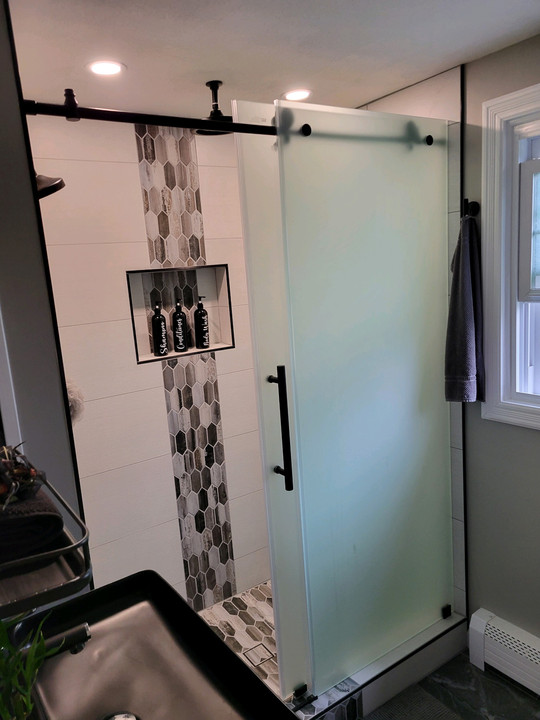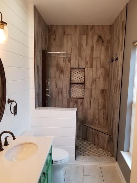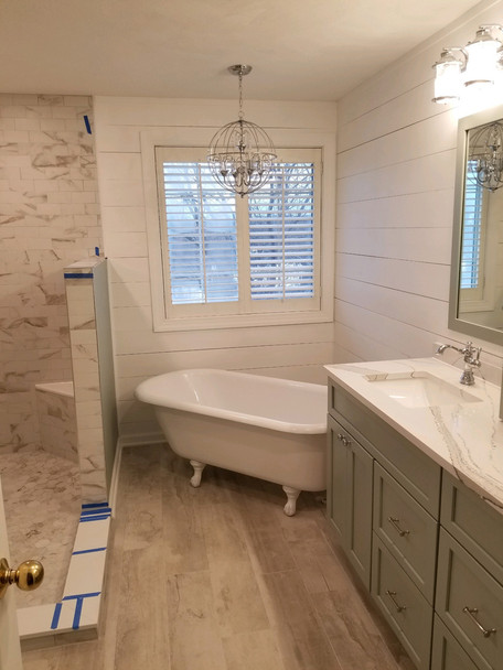 Another total remodel, a refurbished clawfoot tub, radiant heat strips beneath the ceramic tile, custom glass fixed panels, shiplap accent wall behind tub and custom vanity. Let's put something together for your bathroom!!