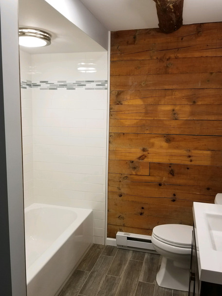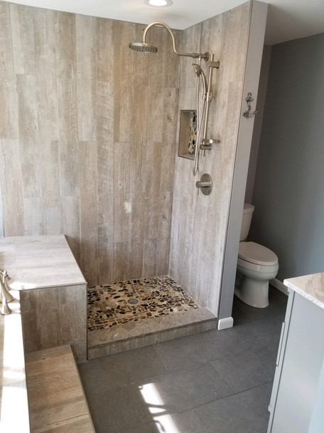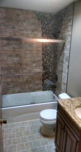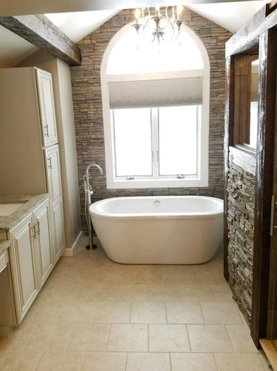 Another total remodel, all new stand alone tub, radiant heat strips beneath the ceramic tile, reclaimed barn beams, stone veneer and custom glass shower door with fixed panel. Let's put something together for your bathroom!!